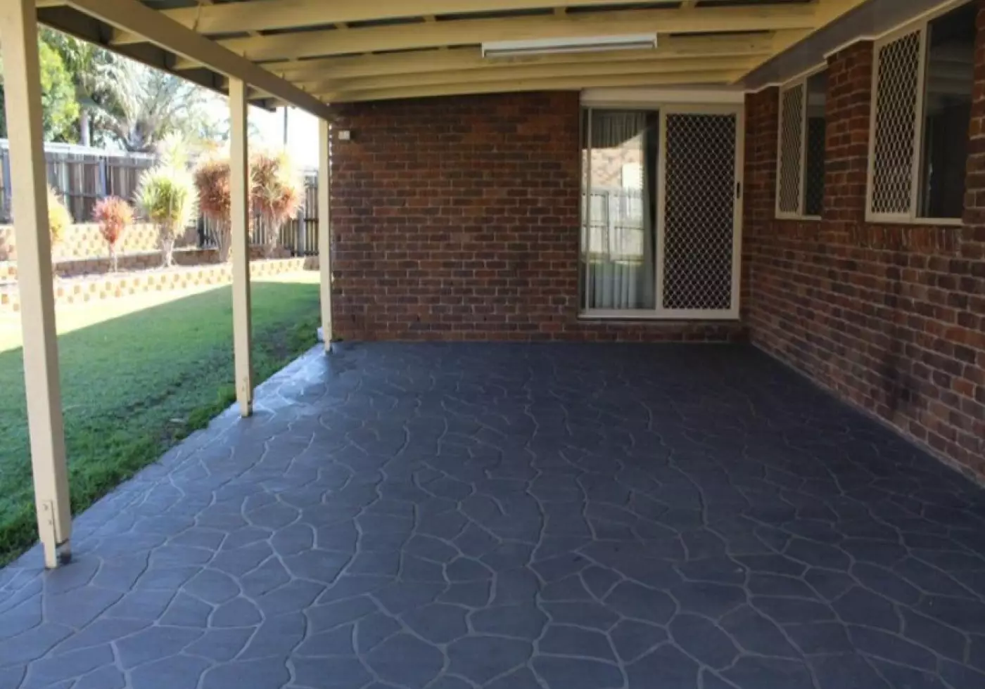 Single drive through under-roof security parking for your car, Fenced yard with side access & low maintenance gardens.