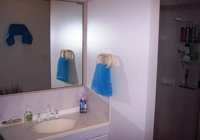 The bathroom has a large shower recess with only a small step up and a good size vanity.