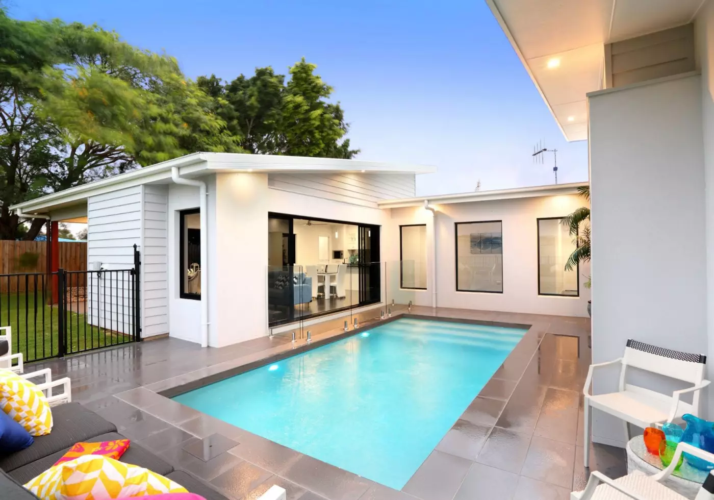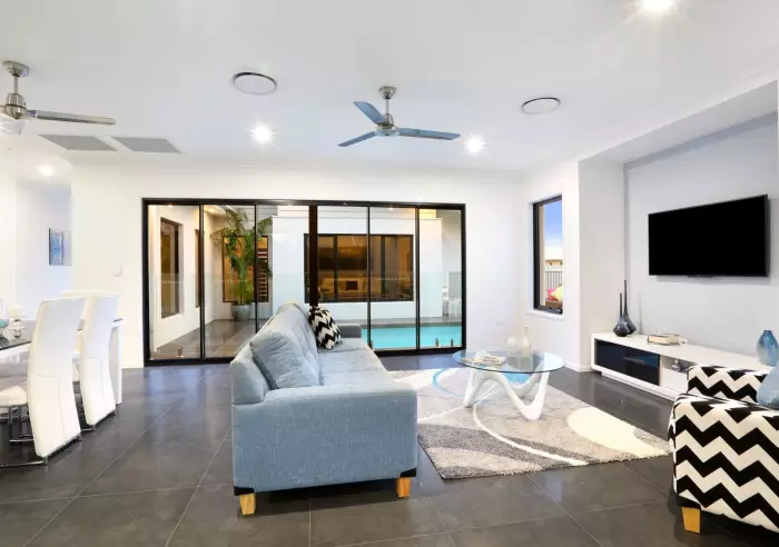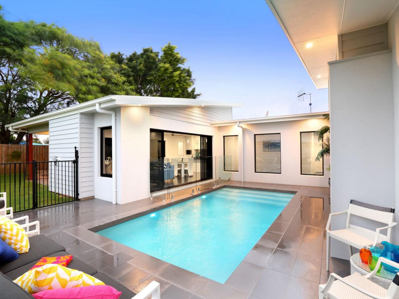 The house has been designed to wrap around the sparkling swimming pool, with fixed glass panels, opening windows and sliding doors incorporated into the house design to let in an abundance of natural light and provide views of the pool from all living rooms, entry and hallways.