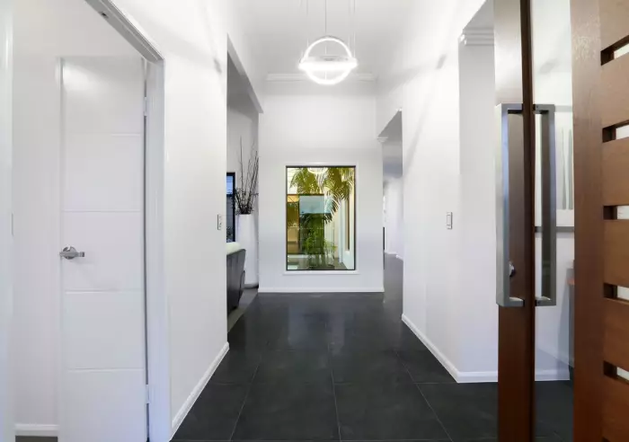 The entry is simply stunning with high ceilings, designer lighting and a large glass window showcasing the sparkling in ground concrete swimming pool.